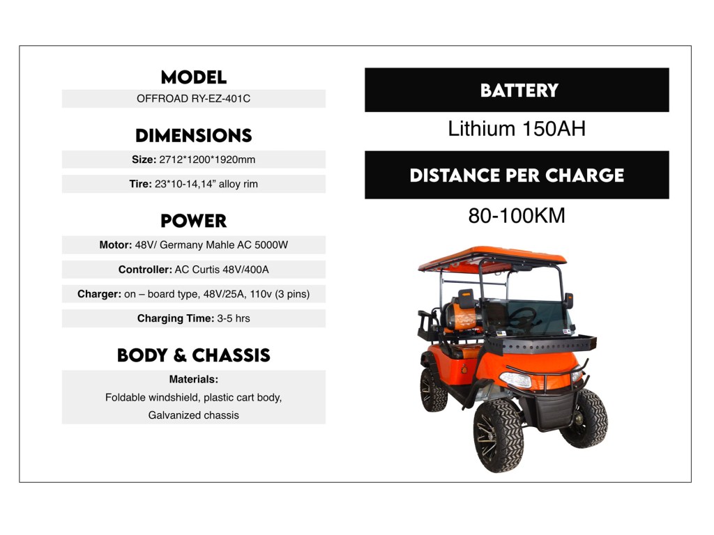 Nuestros carritos de golf eléctricos tienen capacidad para hasta 4 personas (o 2 adultos y 3 niños) y ofrecen un viaje silencioso y cómodo. La carga toma de 3 a 5 horas y se puede conducir entre 80-100KM antes de necesitar cargar nuevamente. Pueden alcanzar velocidades de hasta 40km/hr. Son completamente licenciados, legales para circular en carretera y cuentan con seguro.
